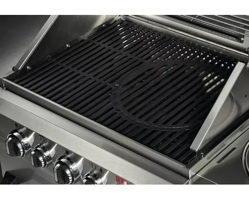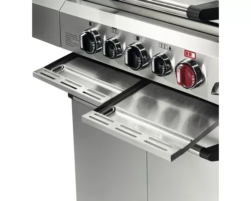 Ausstattung | Turbo-Zone™, Rückwandbrenner, Seitenablagen, Deckelthermometer, Warmhalterost, herausnehmbare Fettauffangschale |