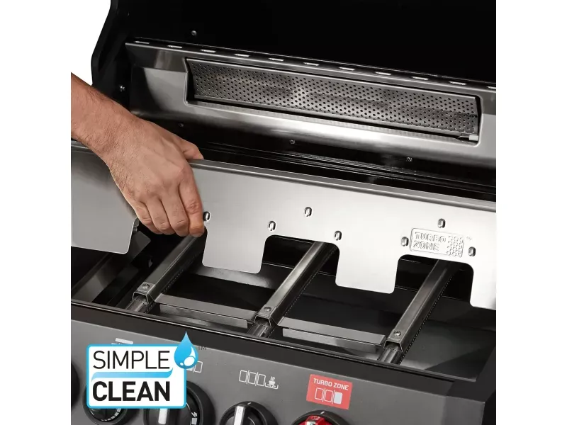 Das große Panorama-Sichtfenster mit Thermometer ermöglicht volle Kontrolle über das Grillgut. Dank Simple Clean™ lassen sich die Edelstahlelemente der Brennkammer werkzeuglos entnehmen. Eine herausnehmbare Fettschublade mit Auffangbehälter erleichtert die Reinigung zusätzlich. Für Sicherheit sorgen Piezozündung, Edelstahl-Flammenabdeckungen sowie Schlauchbruchsicherung (EFV).