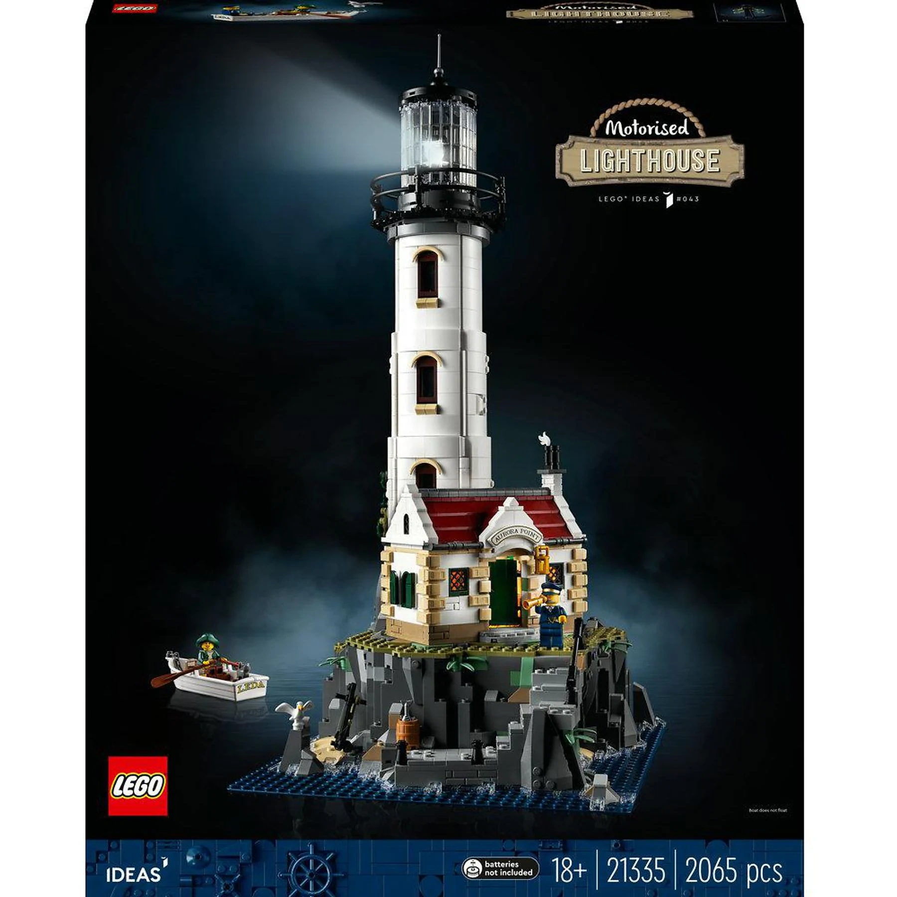 Im Paket | Bausteine für den motorisierten Leuchtturm (2.065 Teile), 2 Minifiguren (Leuchtturmwärter & Matrose), Katze, Möwe, Ruderboot, Kurzanleitung (Batterien nicht enthalten) |