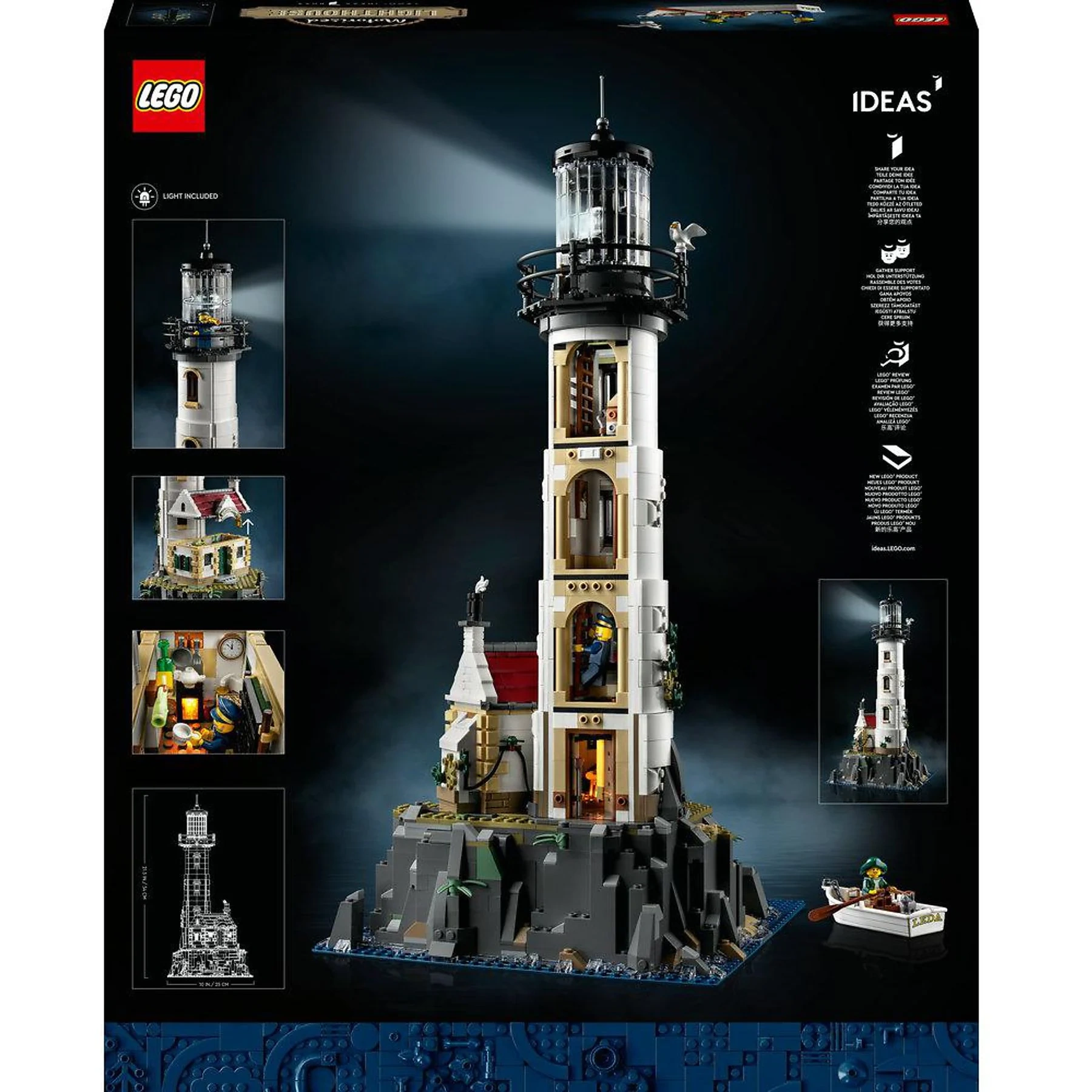 Highlights: Motorisiertes rotierendes Leuchtfeuer, leuchtender Kamin, detailreiche Innenräume, Schatzhöhle, Ruderboot sowie 2 Minifiguren mit Tieren – perfektes Ausstellungsmodell für erwachsene LEGO Fans.