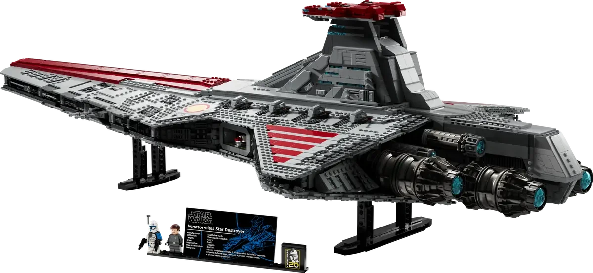 Feiere 20 Jahre Klonkriege mit dem Republikanischen Angriffskreuzer der Venator-Klasse (75367) aus der Ultimate Collector Series. Dieses beeindruckende LEGO® Star Wars™ Modell mit 5.374 Teilen und einer Länge von 109 cm ist eine Hommage an die legendären Schlachten der Republik und ein absolutes Highlight jeder Sammlung.