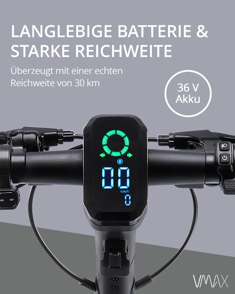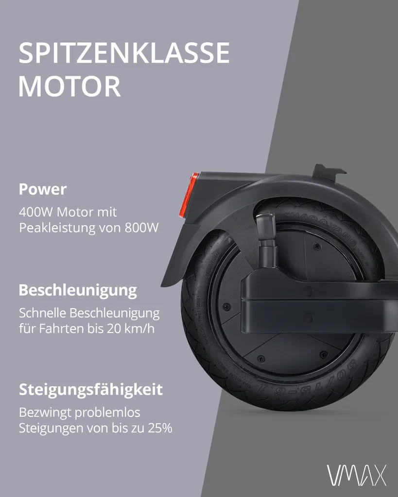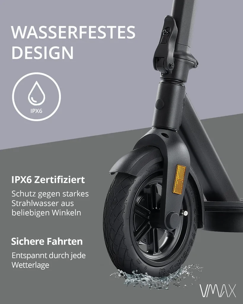 Der VMAX VX5 PRO ST ist ein hochwertiger E-Scooter mit ABE-Straßenzulassung, ideal für den urbanen Alltag. Mit einem kraftvollen 400W Motor (bis zu 800W Peakleistung) bewältigt er Steigungen bis 25% und bietet eine Reichweite von bis zu 30 km. Die Kombination aus IPX6-Schutz, zuverlässiger Bremsanlage und integrierten Blinkern sorgt für maximale Sicherheit und Komfort im Straßenverkehr.